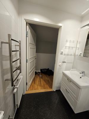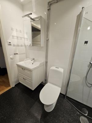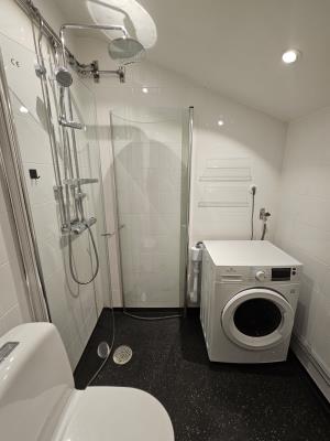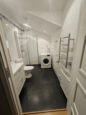 Det fräscha badrummet håller hög standard med moderna detaljer, dusch med glasväggar, handdukstork och egen tvättmaskin – en lyx som gör vardagen smidigare. En mycket genomtänkt och stilren badrumsmiljö.