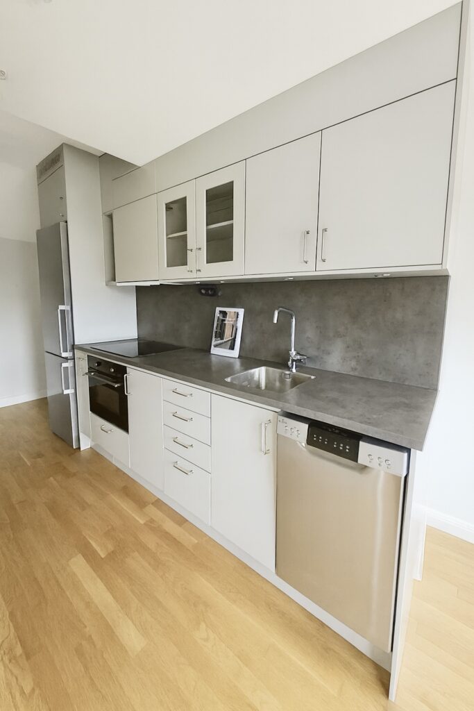 Det smakfulla köket bjuder på eleganta ytskikt och moderna vitvaror – här finns allt du behöver: diskmaskin, spishäll, integrerad ugn, kyl/frys och bra arbetsytor. Perfekt både för matlagning och socialt umgänge.