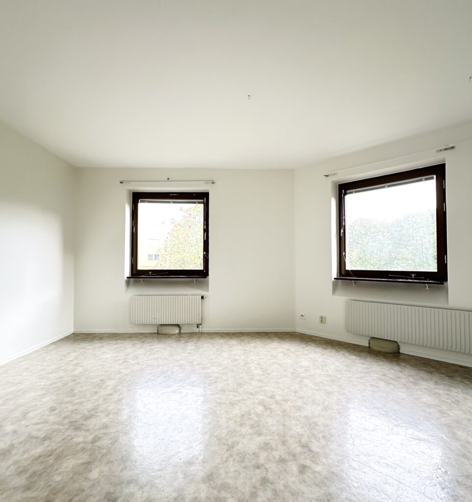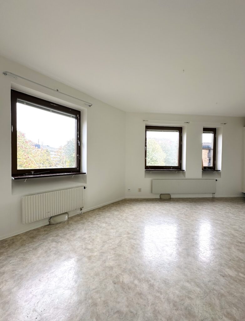 Det är öppen planlösning till rummet där du kan möblera med både säng och mindre soffgrupp & TV möbel.