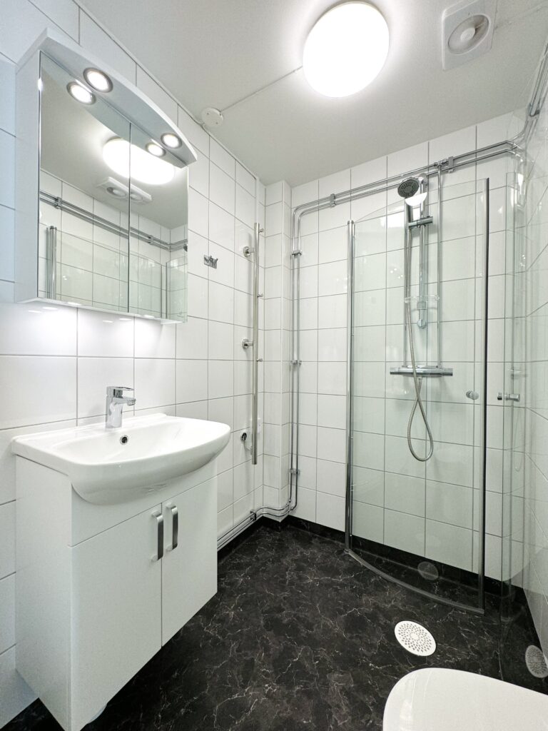 - Badrum: vitt kakel, grå matta, spegelskåp med belysning & el, kommod, duschväggar i glas & handukstork el.