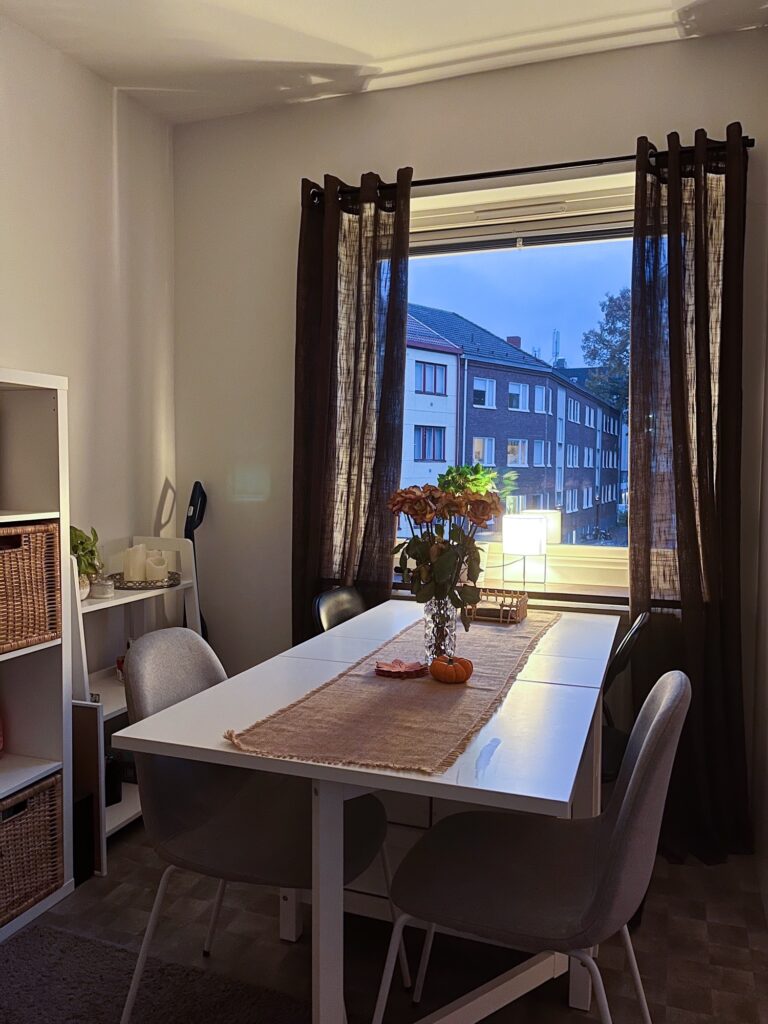 - Vardagsrummet rymmer både matplats och social yta, där stora fönster ger ett fint ljusinsläpp. Härifrån har du utsikt över kvarteret och ett härligt kvällsljus.