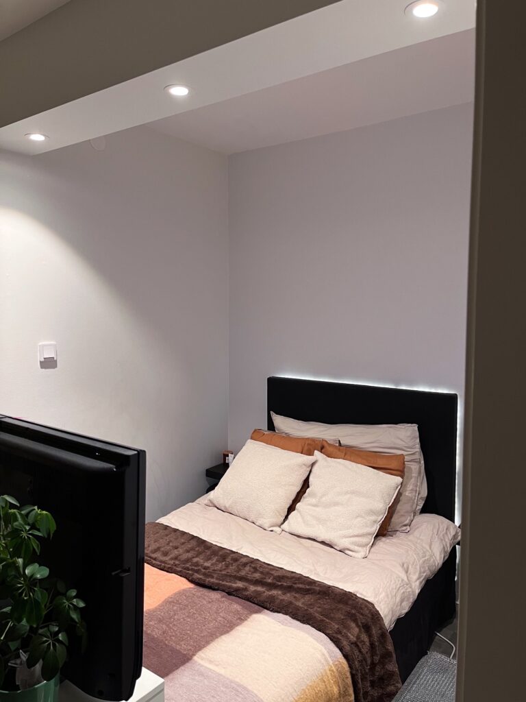 - Sovdelen är smart planerad och mysigt inbyggd med spotlights i taket – perfekt för en rogivande nattmiljö.