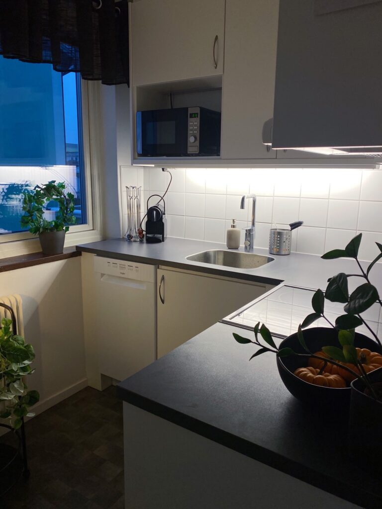 - Köket är både snyggt och funktionellt – utrustat med diskmaskin, ugn, induktionshäll samt kyl & frys i fullhöjd. Det vita Vedumköket med ramluckor, mörk bänkskiva och kaklat över diskbänken skapar en tidlös känsla.