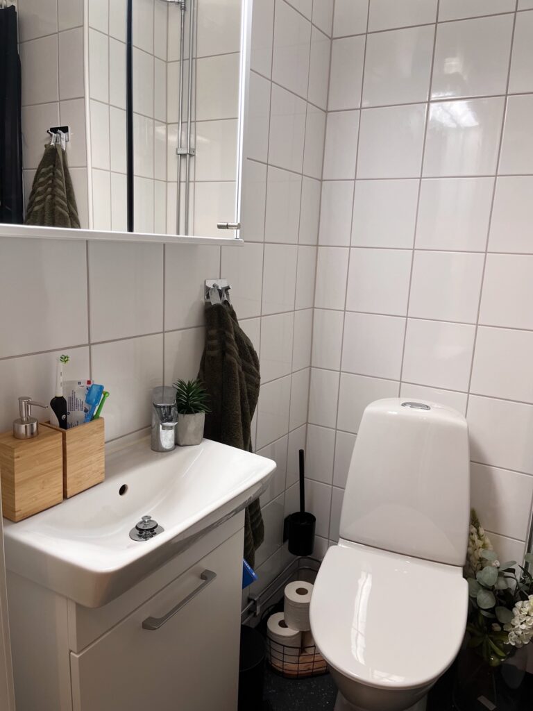 - Badrummet är helkaklat i vitt med en praktisk grå golvmatta, fräscht handfat med kommod och spegelskåp med belysning.