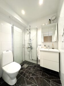 Badrum: Helrenoverat med nytt kakel och klinker, modern kommod, ny toalett och duschvägg i glas.