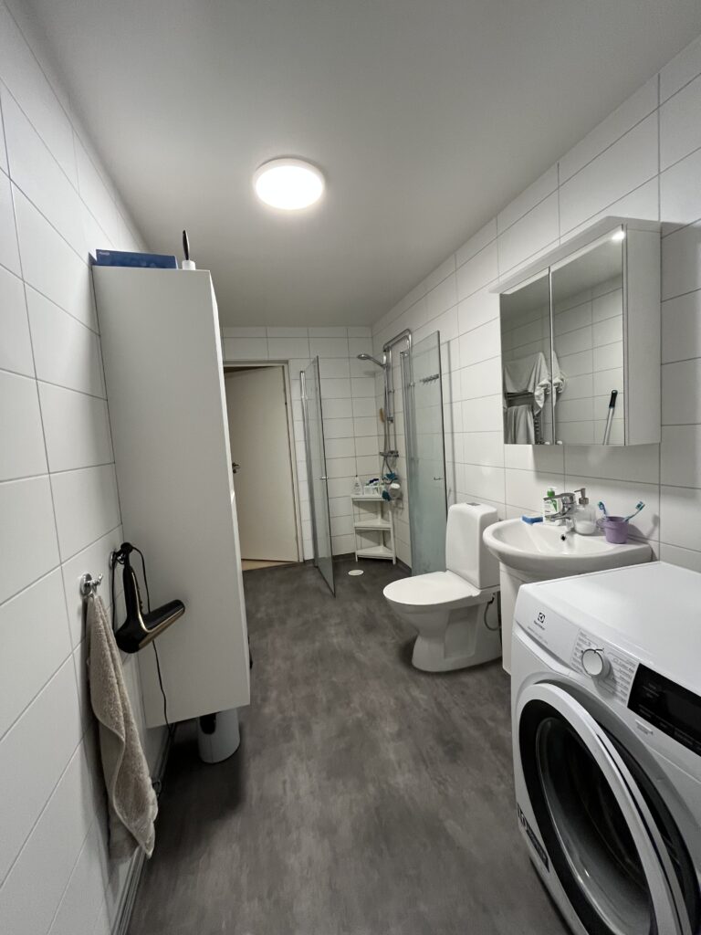 • Modernt badrum med grå våtrumsmatta & vita kaklade väggar, duschväggar i glas, badrumsskåp, handukstork, kommod, spegelskåp med el samt tvättmaskin.