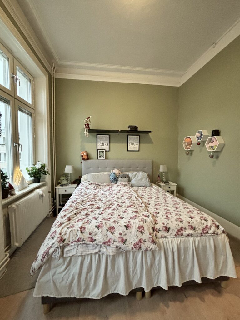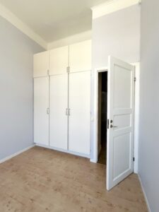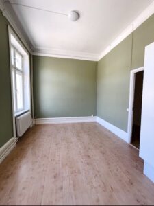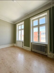 Två sovrum med höga fönster och bra ljusinsläpp