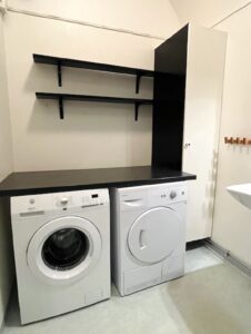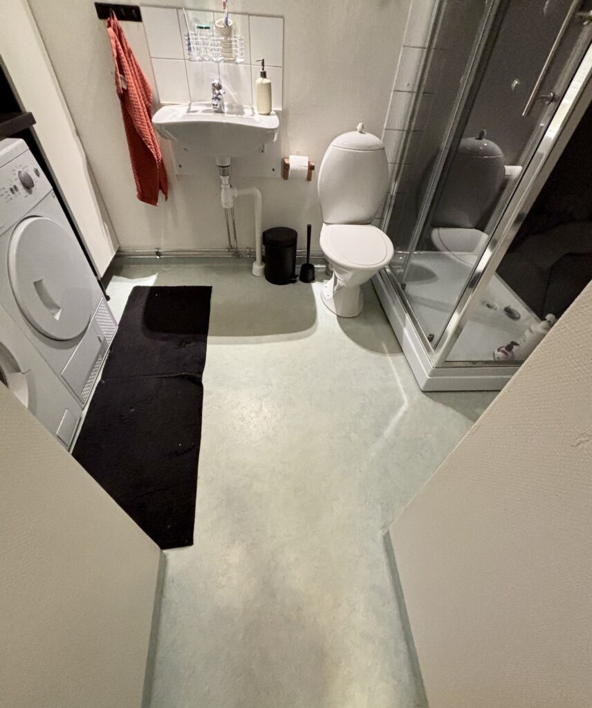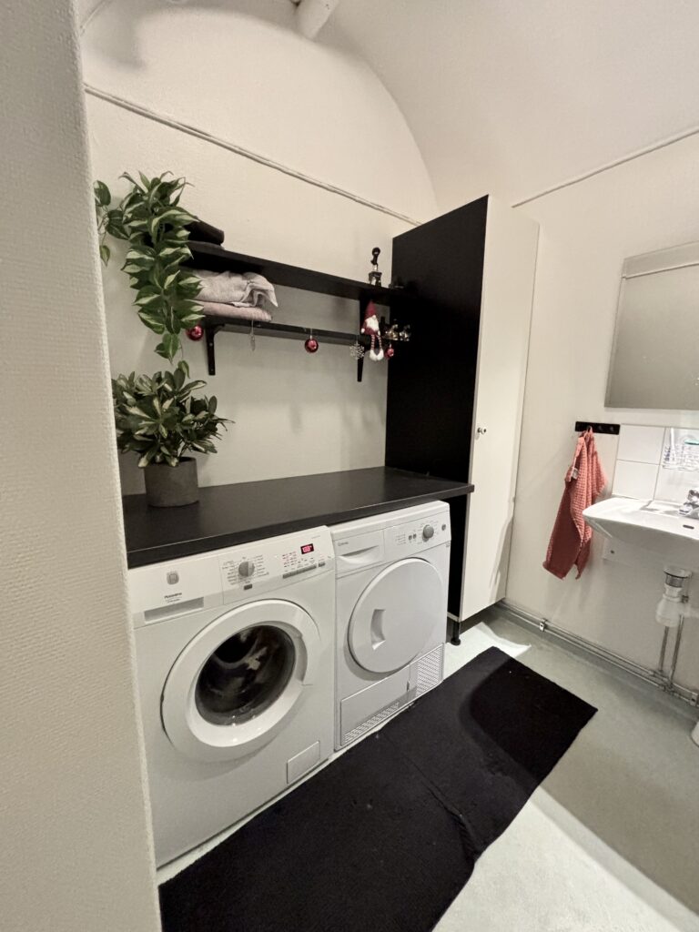 Modernt badrum med duschkabin, egen tvättmaskin och torktumlare