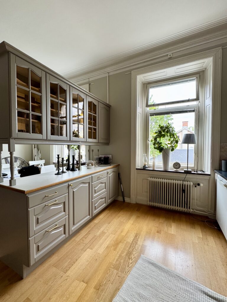 Köket är charmigt med gott om förvaring, klassiska skåpluckor, fina detaljer och plats för ett stort matbord.