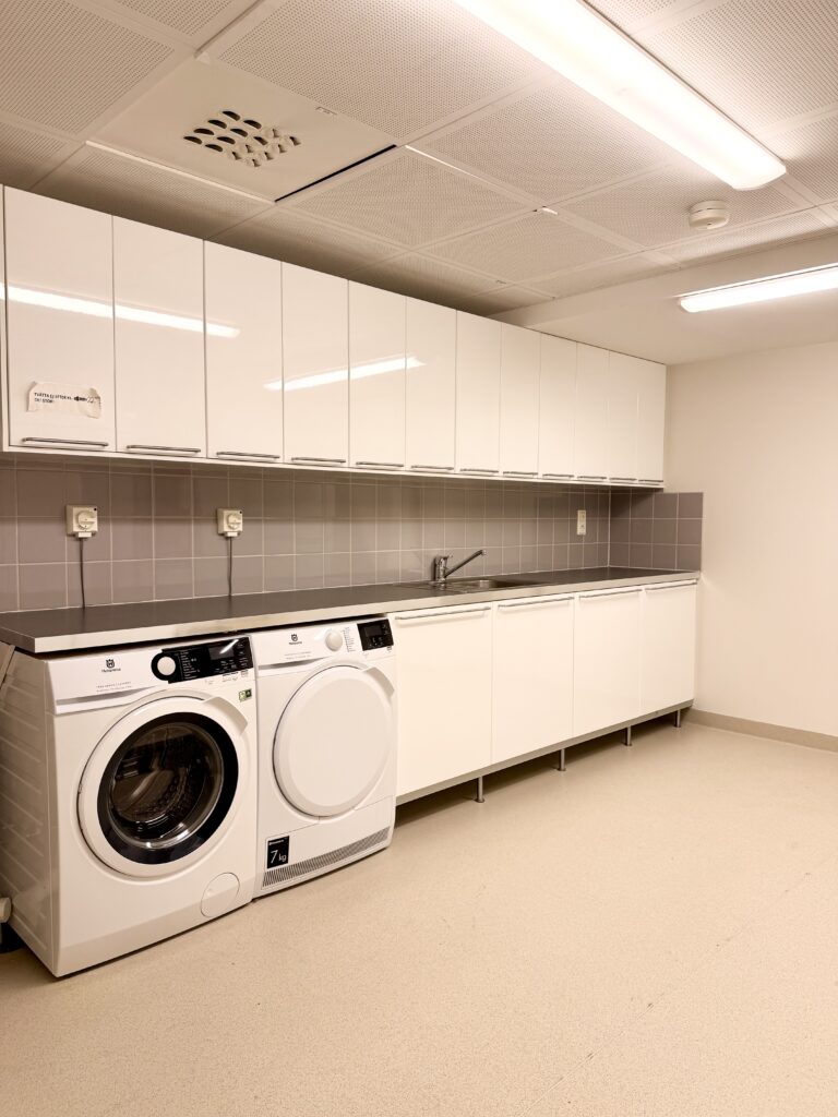 De gemensamma utrymmena består av ett stort och inbjudande allrum med soffgrupp och TV – perfekt för umgänge, filmkvällar eller avkoppling efter studierna. Det rymliga och fullt utrustade köket har gott om arbetsytor och förvaring, med egna skåp för privata köksattiraljer, vilket gör vardagen både praktisk och smidig. Här finns plats för flera att laga mat samtidigt i en trevlig och social miljö.