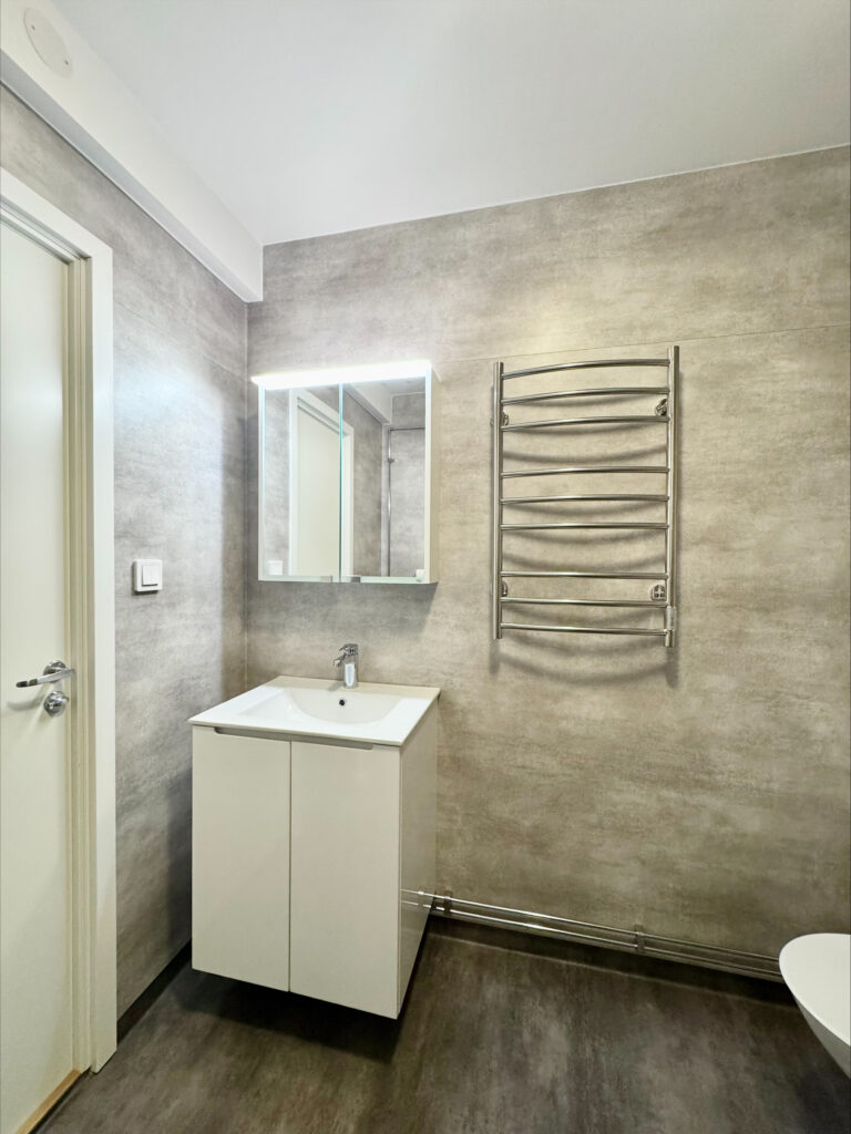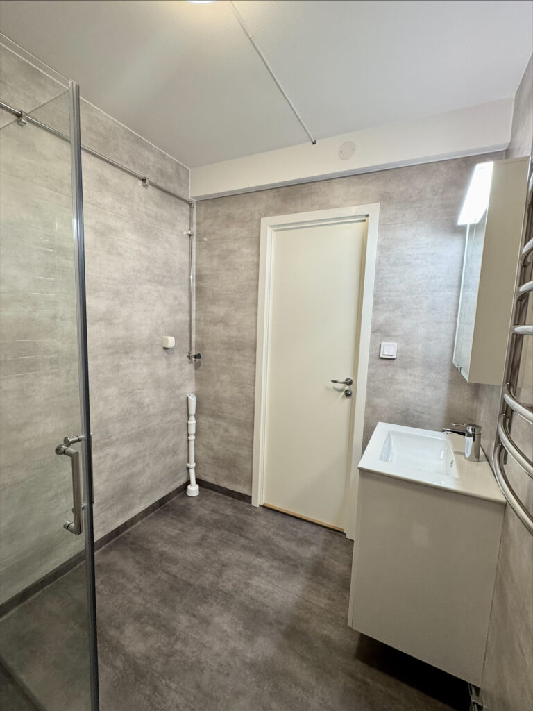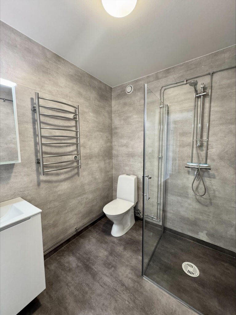 Det moderna badrummet bjuder på stilrena materialval, glasvägg till dusch, belyst spegelskåp och handdukstork – allt i en sober grå ton som andas elegans.