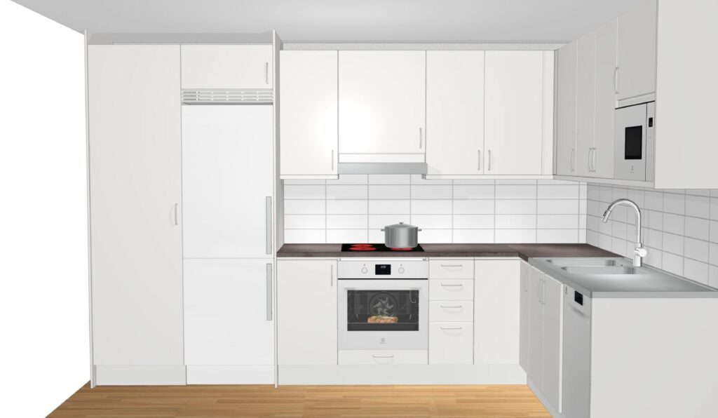 - Vedumkök: Släta luckor, diskmaskin, inbyggd micro, kakel, delad kyl/frys